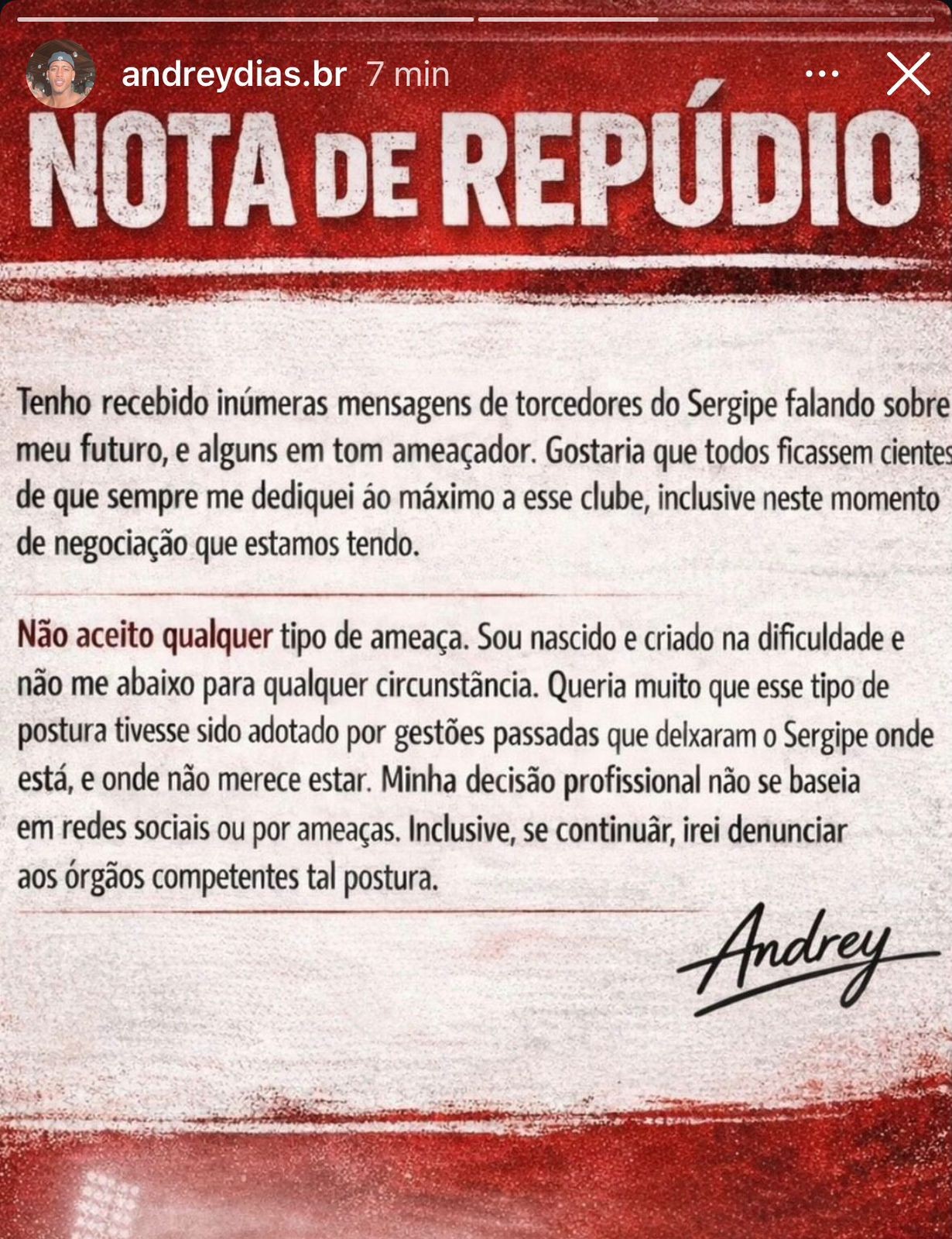 Toda decisão pode gerar repercursão, e as vezes não positiva, levando o profissional repudiar ameaças que vem recebendo, esclarecendo e desabafando em sua rede social, através de uma nota, mostrando o que fez enquanto esteve vestindo a camisa do clube do bairro Siqueira Campos.